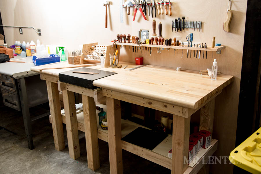 Tooling on this thing is now rock solid, the tools are all within easy reach, and I have a bit more storage underneath (here’s a link to an older all-around workbench tutorial I wrote). The tool rack shown was ultimately replaced by a leather strap that holds the tools against the wall. I learned the hard way that a sharp exposed knife held off the wall can make for a trip to the doctor for a few stitches!