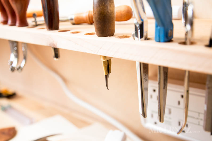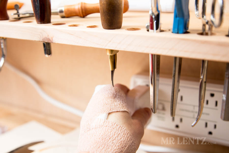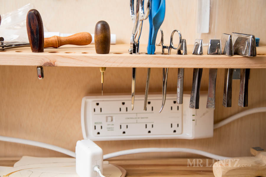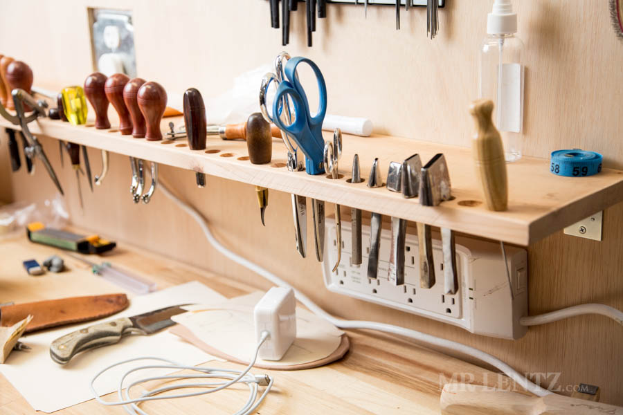 A few weeks ago I finished building a new leather tooling table. I was excited to get the tools up on the wall and had seen several different ways to do it. The version I liked best was that shown above. It extended the tools out a bit further from the wall, putting them within easy reach, while also providing a shelf to place other random items. In theory this should work well…in practice it is potentially dangerous and here’s why.