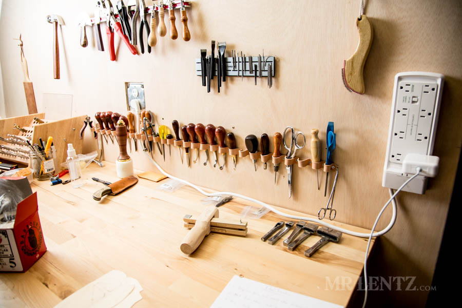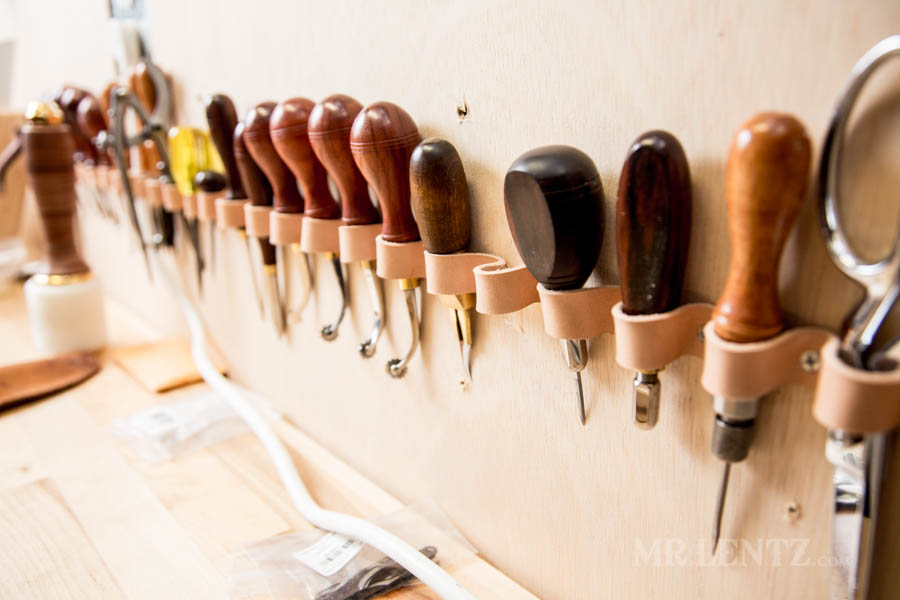 Now, with that lesson learned – I wanted to pass things on to my readers as well, so that they don’t end up making the same mistake. Initially I thought of a few ways to keep using that board with tool holes in it. I installed a small backboard right behind the tools, then decided it was still possible to get a jab here and there if I wasn’t careful. I also considered some plexiglass placed in front of the bottom of the tools to prevent reaching in. That would have worked, but also would have given up all the table space below. So – I settled on another storage style very commonly seen in saddle shops, strips of leather screwed to the wall. It’s simple, fast and easy to put up. It also keeps any blade practically pressed against the wall itself.