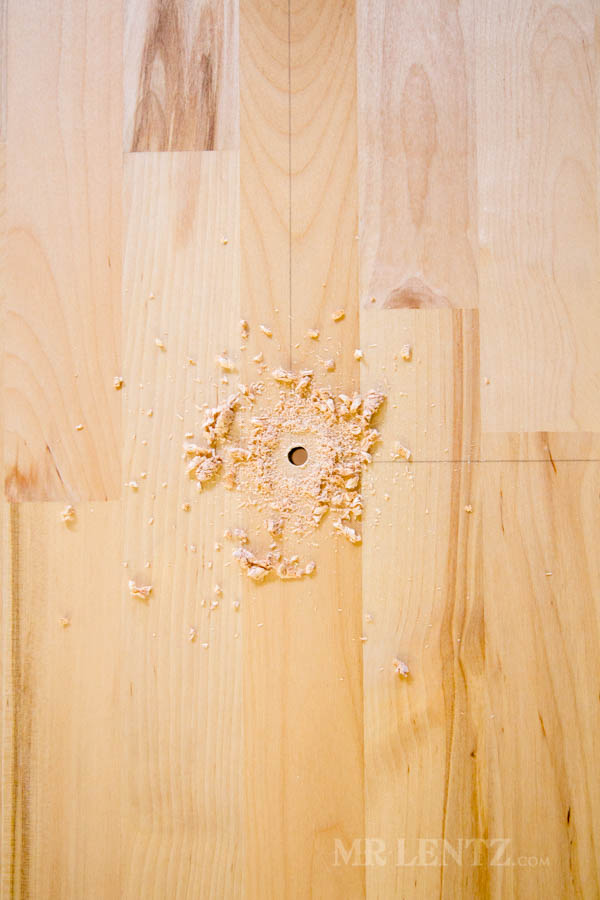 I was a little wary of cutting my brand new maple top. I wanted to make sure I got the measurements correct because there would be no going back. I must have measured and remeasured many times then double checked those measurements too! The bottom line is this – it should fit right around the granite block and the block should reach out barely past the edge. To allow for a bit of error I measured things just over 1/8″ wider than for a perfect flush fit. That gave me room to play if something was slightly off, plus I know it to be easier to make the first cut than to go back and make a second adjustment cut. I drilled two holes at each of the corners where the granite would go to help prevent overcutting.