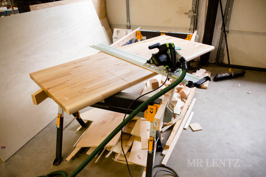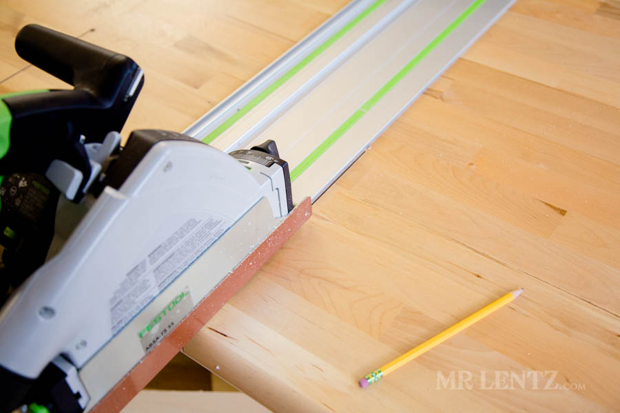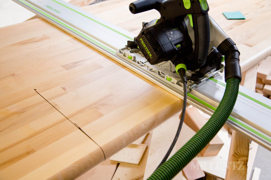 At first I tried a jigsaw (not shown), and realized a few inches in that the blade would cut through the 1 3/4″ top…but on the up-stroke it went above the bottom plane and caused the saw to veer off course and cut an angle, whoops! So plan B, which should have been plan A was to use the track saw on a track and gently ease into the cut, getting as close as possible to the drilled holes. And no – I am not sponsored by any of the tools shown on these posts! Any brand will do.