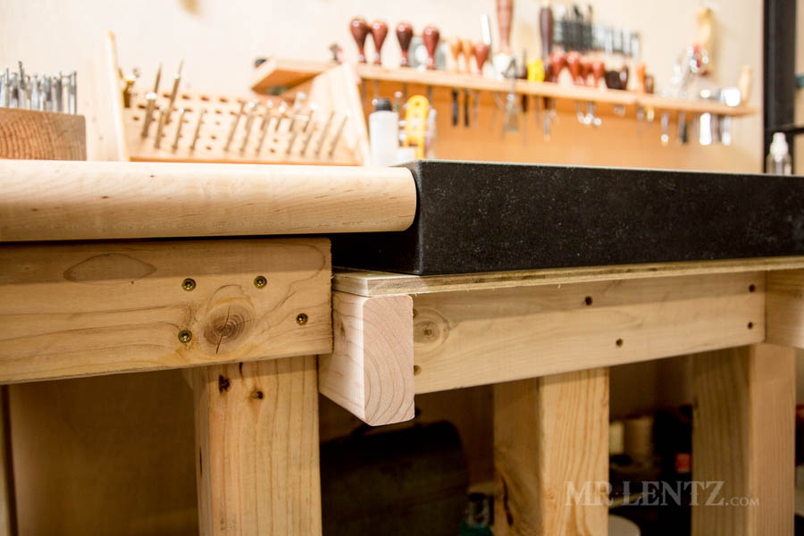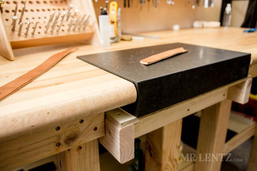 As a final touch I sanded up the edges to clean it up. I attached the top to the apron using small L-brackets placed in the center of the table. This allows for the normal expansion and contraction of the wood along the table apron. Everything fit quite nicely as you can see with one exception. I tested out a little stamping on the granite and realized the bounce issue needed more work. In the image above you can see the third leg I added with an additional crossmember. That was a quick fix. I also used a little help from some store-bought 1/32″ plastice wedges placed under the legs to balance everything. It is now officially a leather tooling table / tank.
