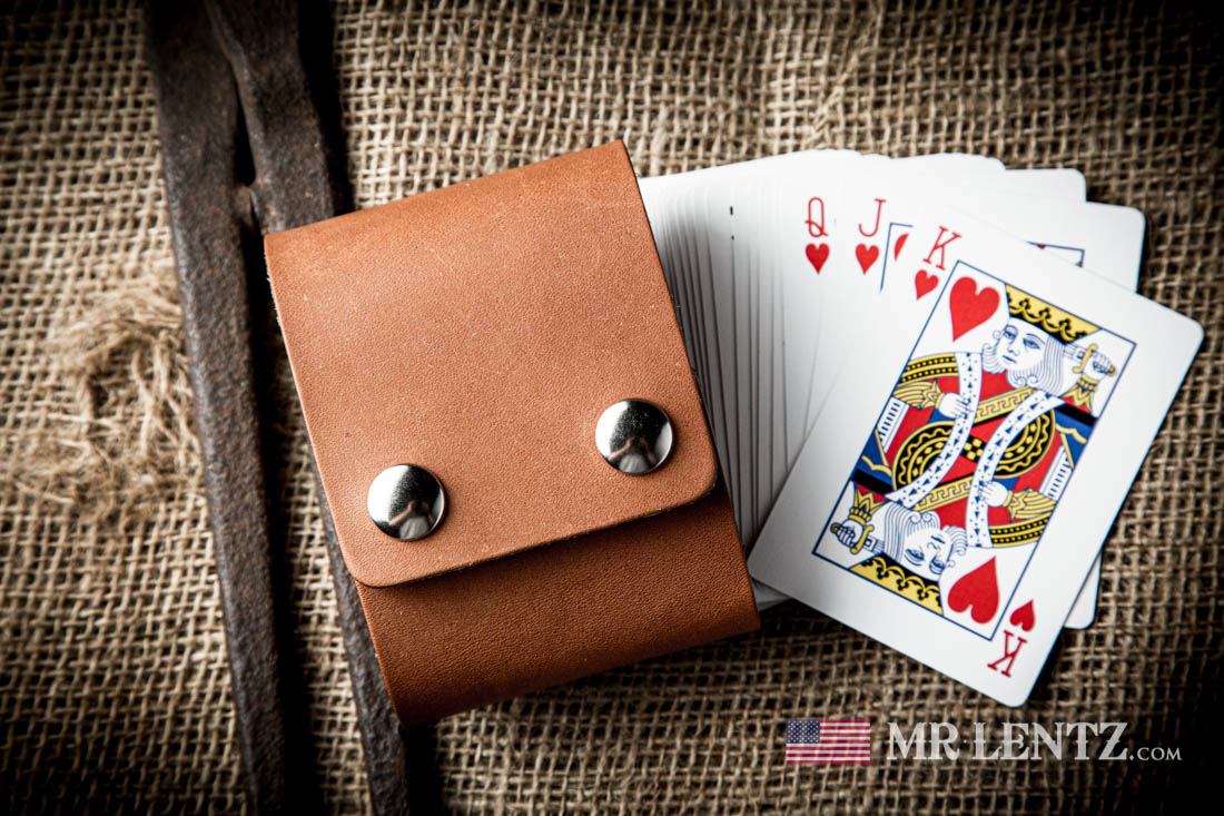 Exterior of card case measures approximately 4 1/4″ tall x 3 inches wide, and around 1 1/4 inches deep. Optional card deck is 3 1/2″ tall x 2 1/2″ wide, they are standard higher end playing cards.