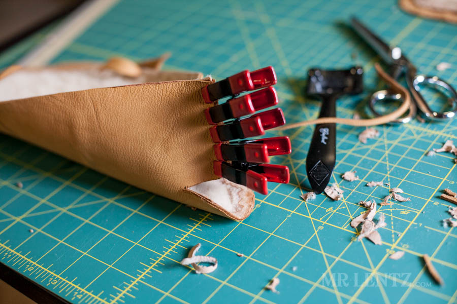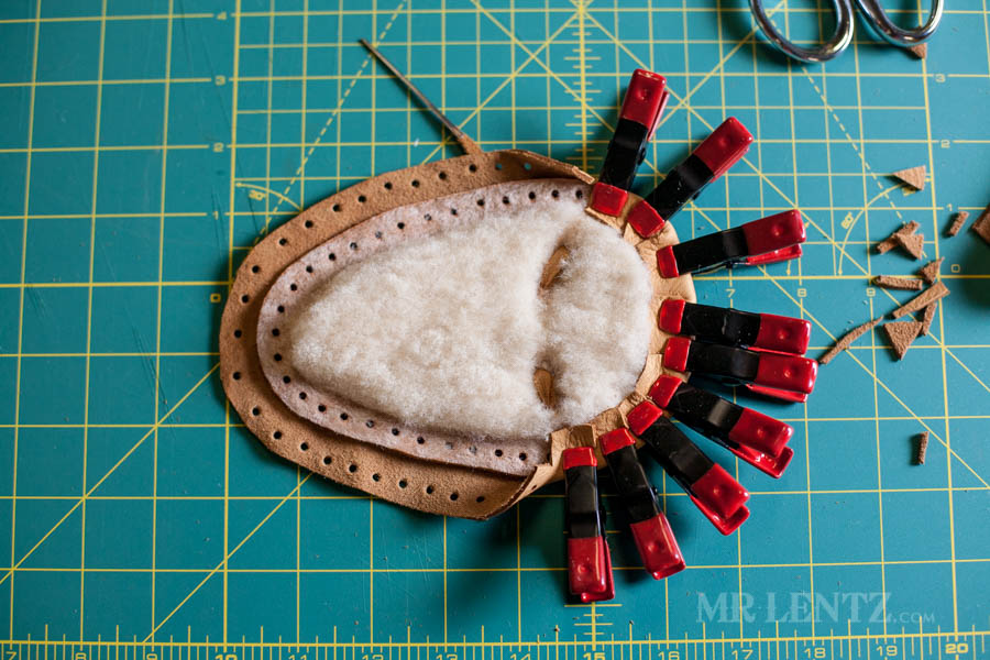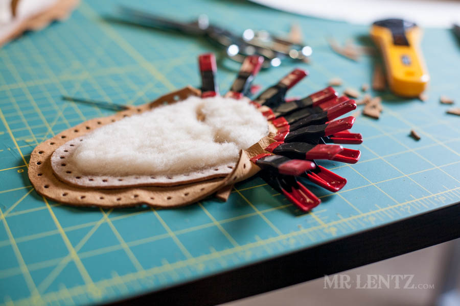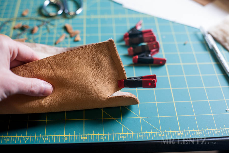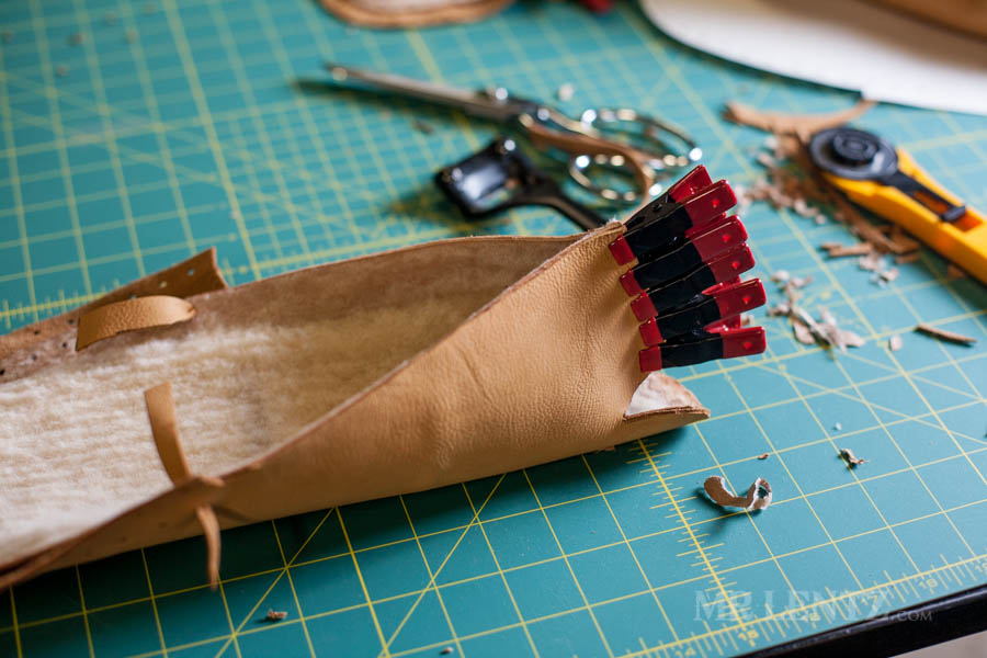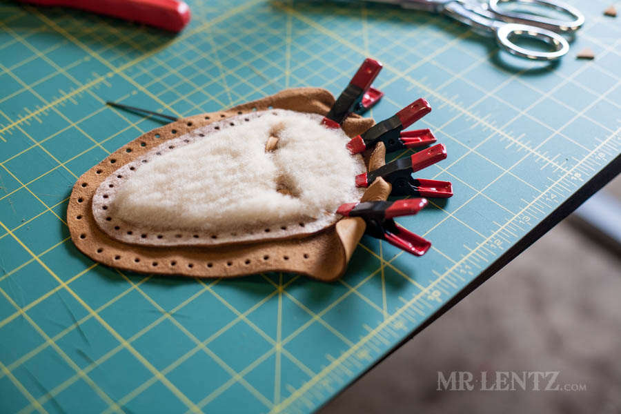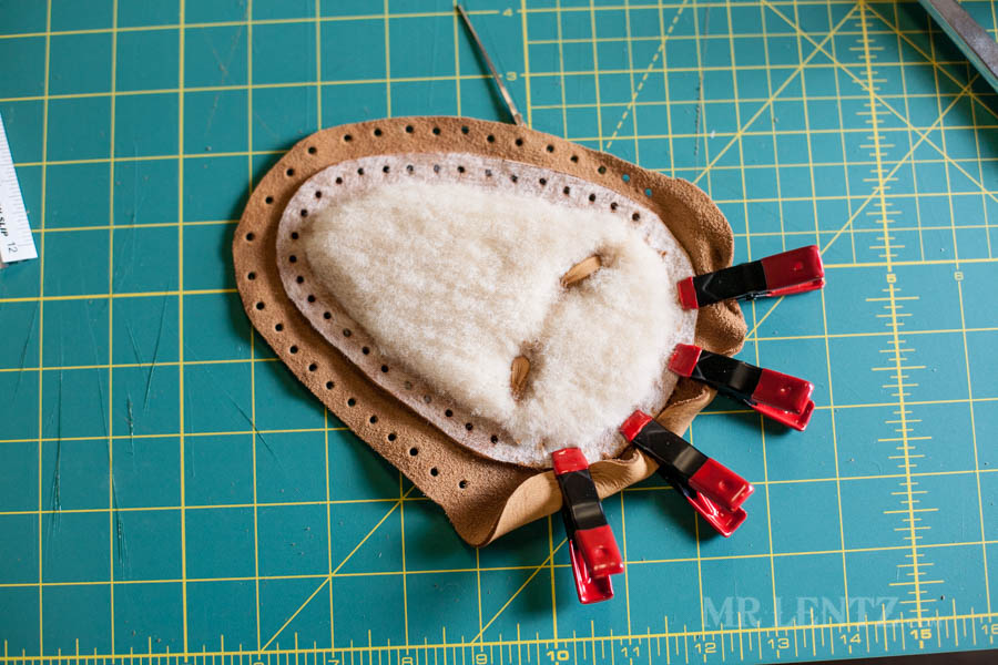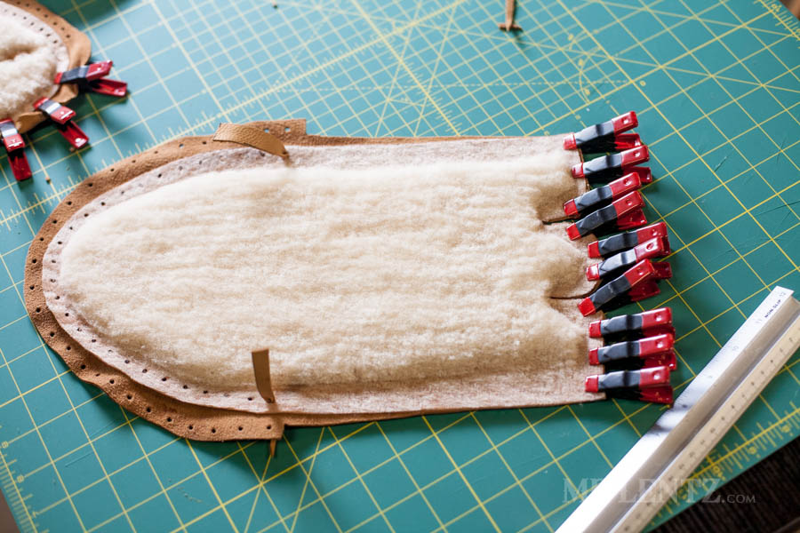 On the body of the moccasin I clipped both the deer skin and the shearling together first to line things up. Then I carefully glued between the pieces on the back end of the leather and replaced the clips. Make sure to wipe off any glue that seeps out after replacing the clips.
