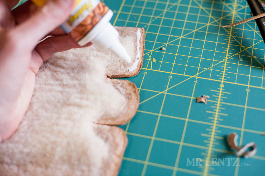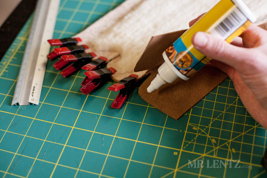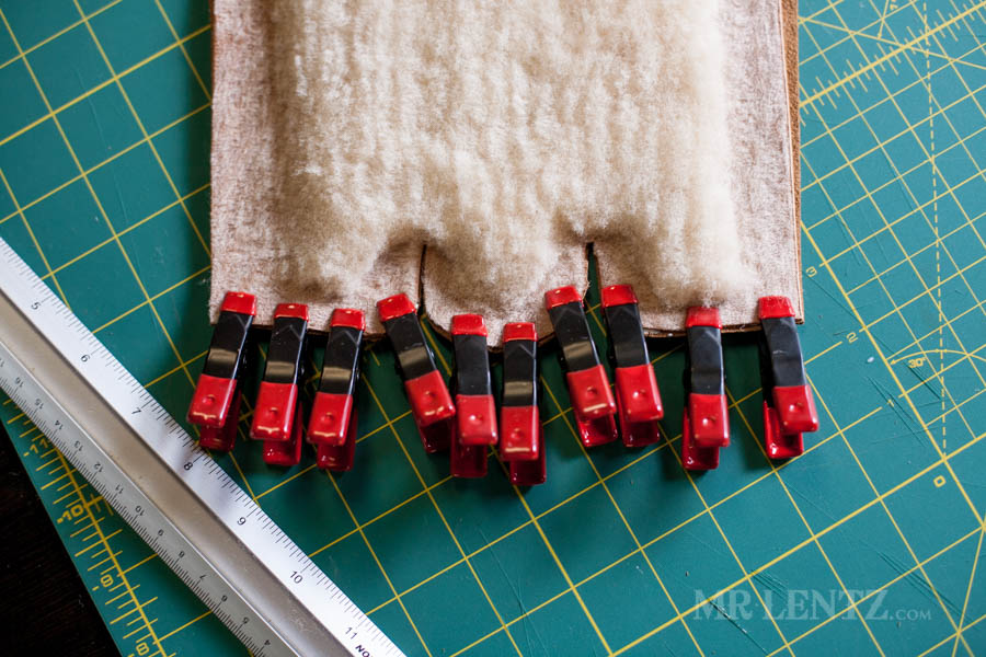 I like to let the glue set for about 1 hour just to make sure it’s holding things tightly. There’s no real need to glue up any other part of the deer skin with the shearling, only where the clips are shown above.