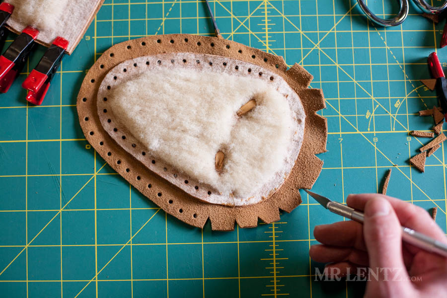 Next – we need to be able to fold the deer skin over the shearling before sewing. This will give a more finished look to the piece and it’ll be more comfortable to wear. When you fold leather over on itself, you need to cut what are called ‘darts’. This is basically removing material that would otherwise bunch up on itself and make sewing impossible. It’s important to note (because I screwed this up the first time myself), that the darts are slightly closer together in tighter curves and they should only be cut into the leather 1/2 the distance to the shearling liner or less. The reason is that when you fold the leather over, you want those folds to be hidden under and out of sight, trust me! If that all sounds confusing, just make your darts look similar to the above and you’ll be fine.
