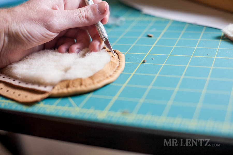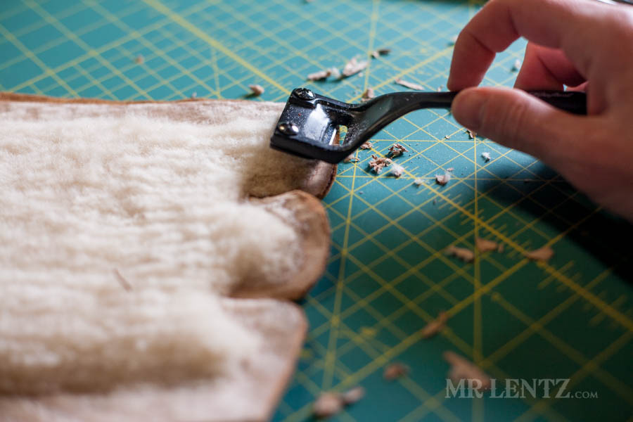 Using the exacto knife carefully pull up on it and cut it off, leaving about 3/16 inch left away from the stitch. Don’t cut into the shearling!
