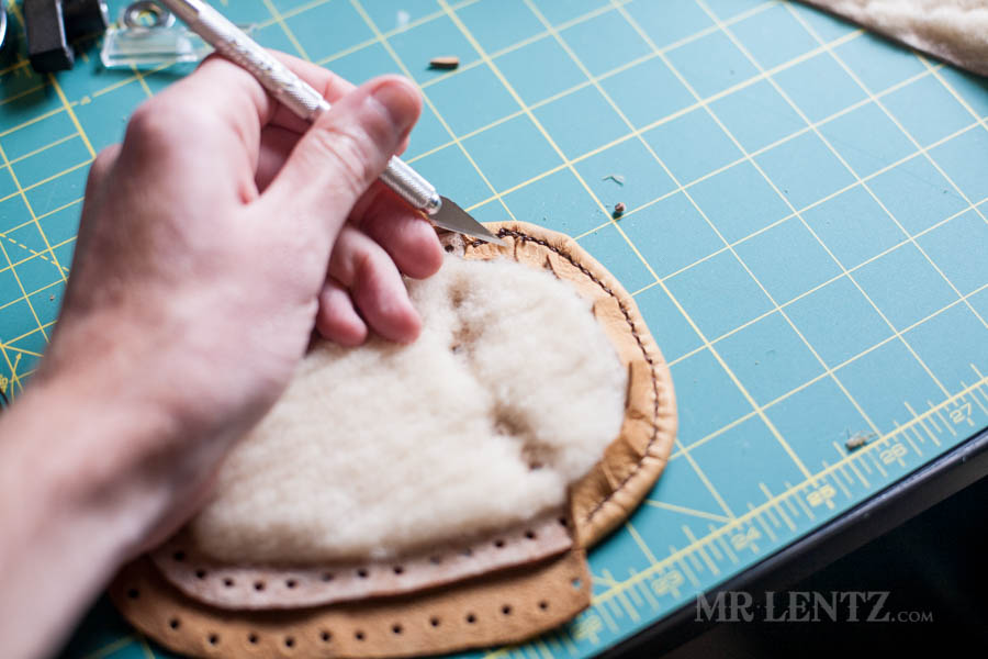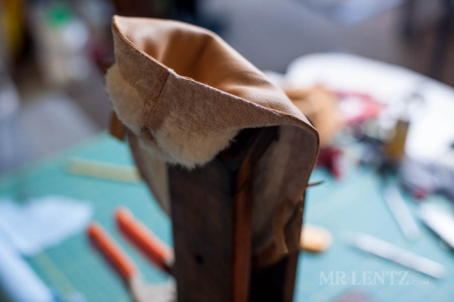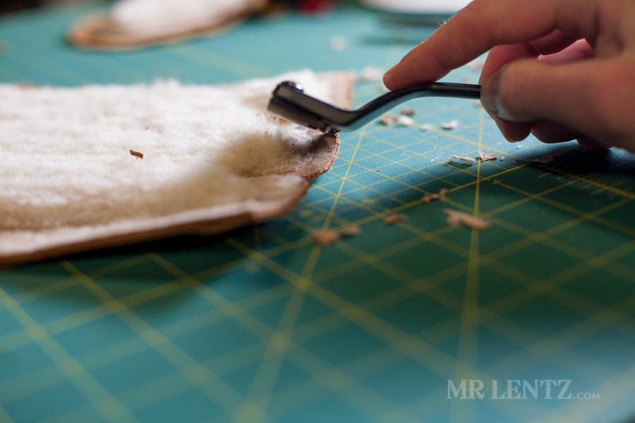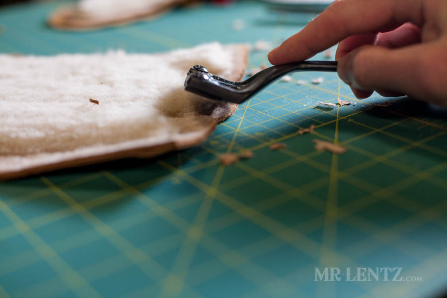 To prep the body for gluing I found that you can improve the look of the back end of the moccasin by removing some of the leather at the back edge. Using a skiver I very carefully stripped away the leather in small cuts at a time until the edge was down to the deer skin. Basically I removed the layer of shearling glued to the edge. This way when you glue each side together it will be flatter and fit together much more easily. Careful with that skiver though – it’s easy to take off too much and there’s no going back!