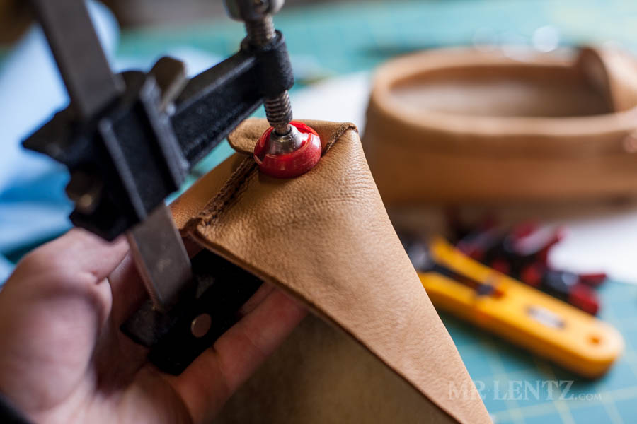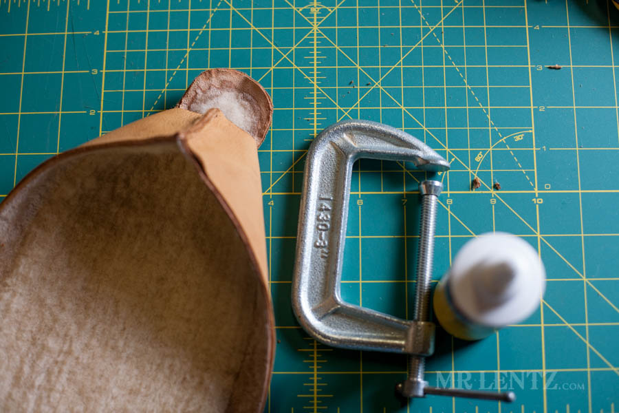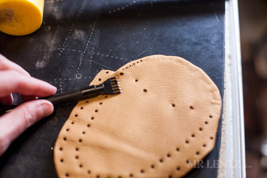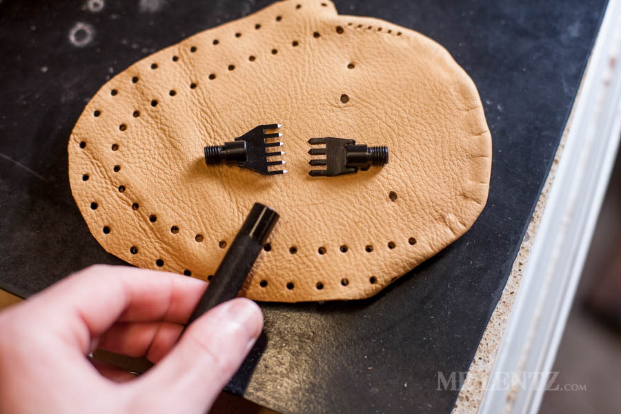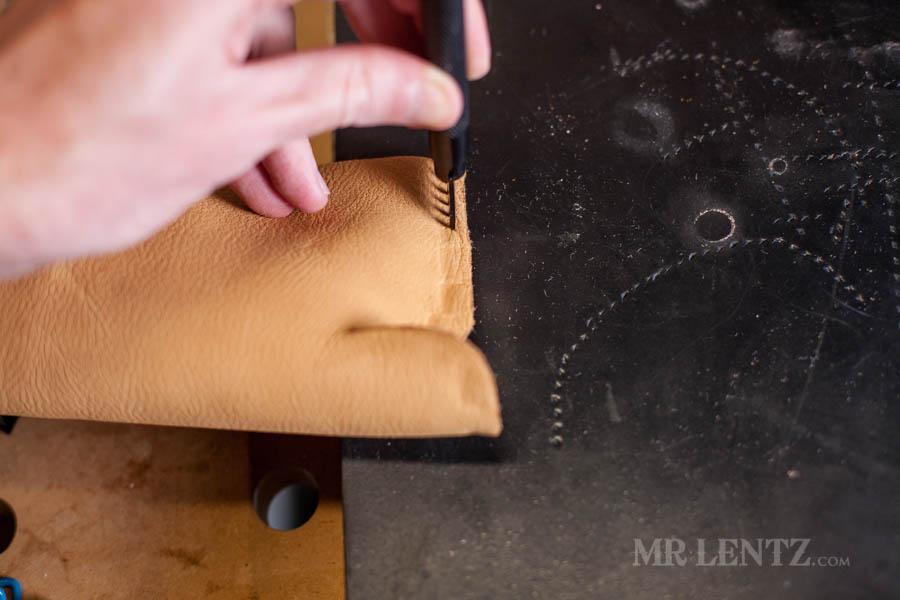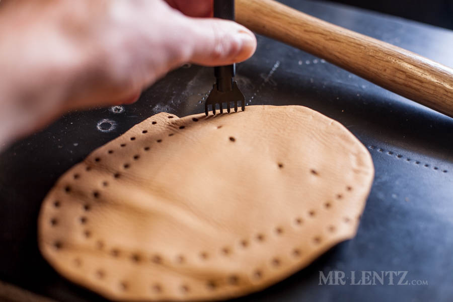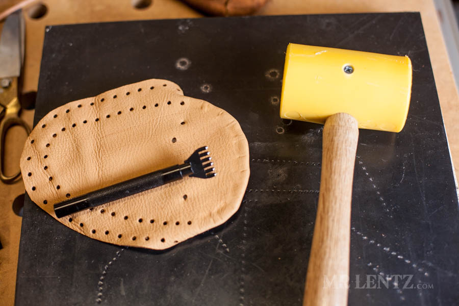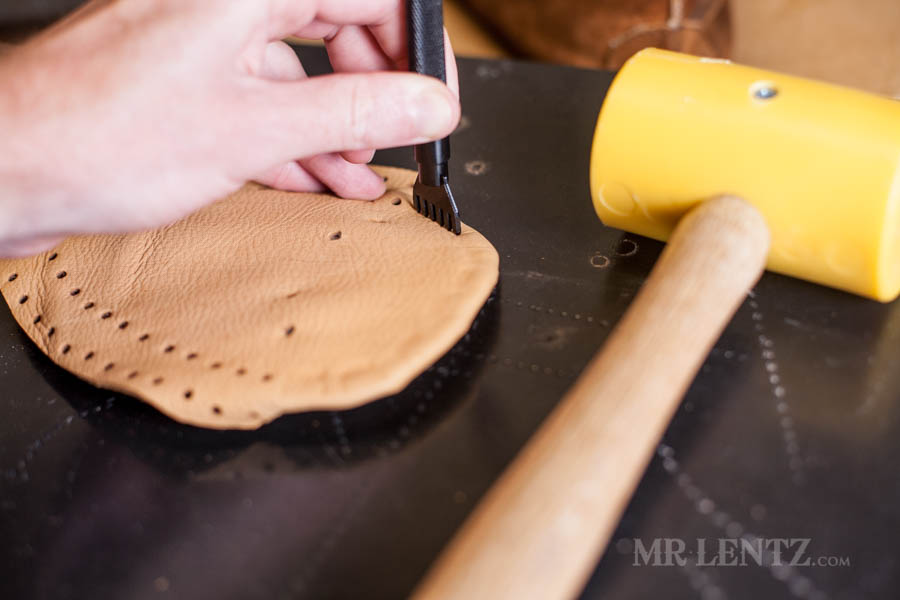 Next I punched the stitching holes around that curved piece I just glued. This is definitely not a very easy step as you kind of need to do what you can to squish the piece down to hammer in the holes. Place the holes all the way around that curved piece about 1/8 inch from the edge.