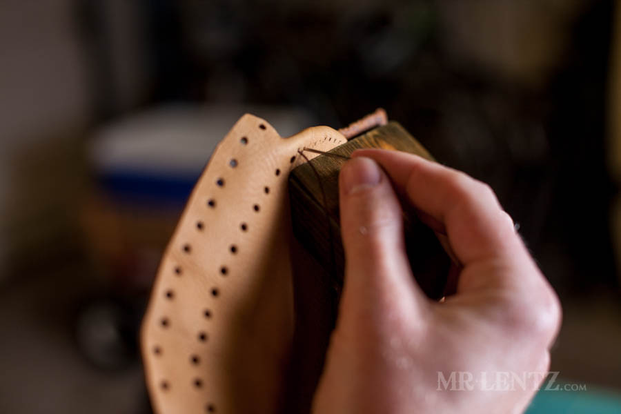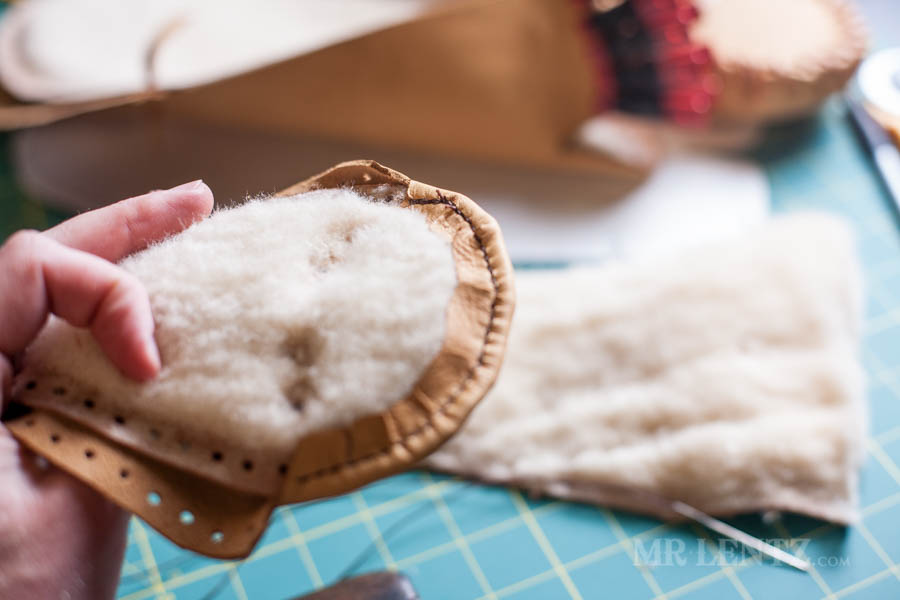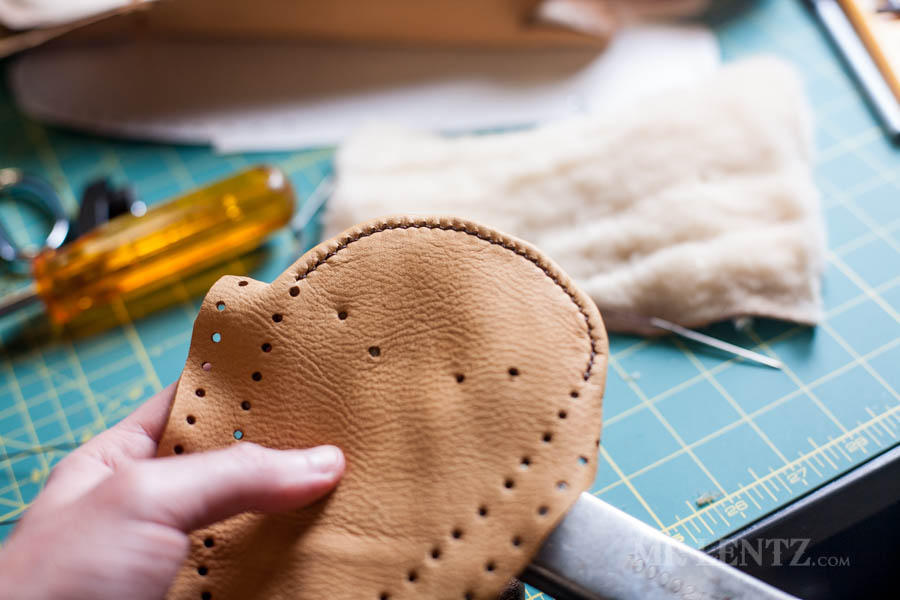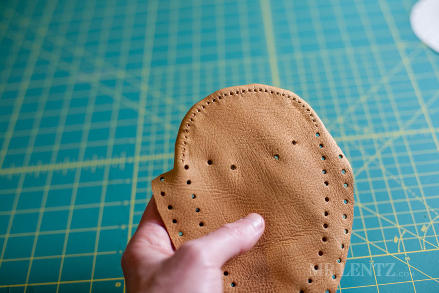 The next step it to stitch it all together. I have explained and photographed the entire stitching method in other tutorials, so head on over to this one here and scroll down a ways to find the stitching instructions typed out. The video at the top will show the entire process as well and you can easily navigate to it by clicking ‘Stitching’ linked below the video. It’s the same thing that you will be doing on the moccasins.