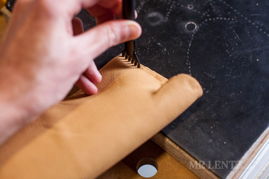 Now we need to stitch the upper together. The deer skin and shearling lining will be stitched together along the area we glued. Grab your stitching prong – I used a fairly tight spacing on mine as it will give a nicer look to the stitch. I also started with the six hole prong, which is well suited for longer less curvy areas. Use a rubber mat underneath to protect the prongs. I also have a 1.5 inch thick marble slab to help control vibration when using the mallet ( a good investment!).