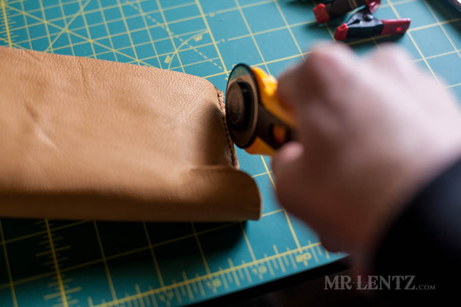 Next, I cut very closely to the stitch, removing excess leather. I left about 1/8 inch from the stitch. This will help flatten things out a bit when you stitch the next piece over the top of it.