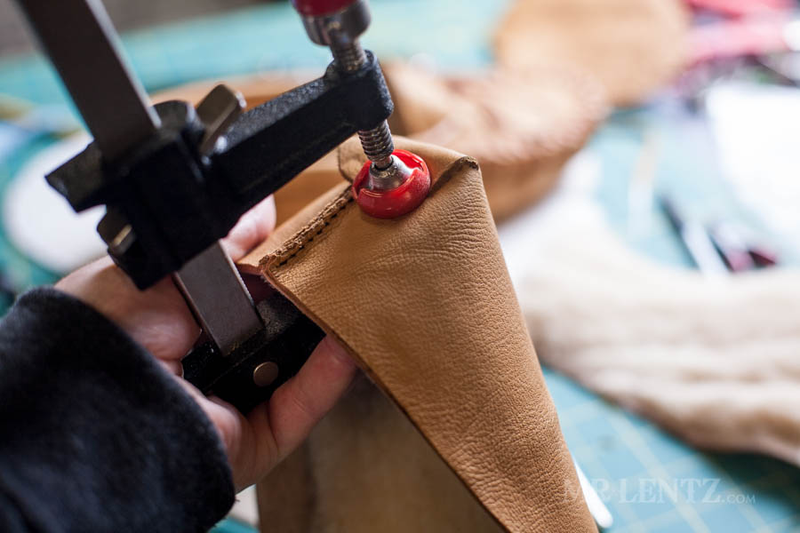 In Part 1 of this tutorial, we did a lot of cutting, shaving, hole punching and generally prepping the leather for the next stage. Here in Part 2 of this tutorial we are going to glue things together and stitch them up. Above I have taken the deer skin and the shearling of the upper and put glue between them only on the part just underneath those clips. I chose not to glue the whole piece together as the glue may wear over time and it could be visible on large flat surfaces. By only gluing at the top – we are just securing the pieces together long enough to punch the stitching holes and stitch them together. the other edges with the holes punched in them will be laced together and do not need glue.