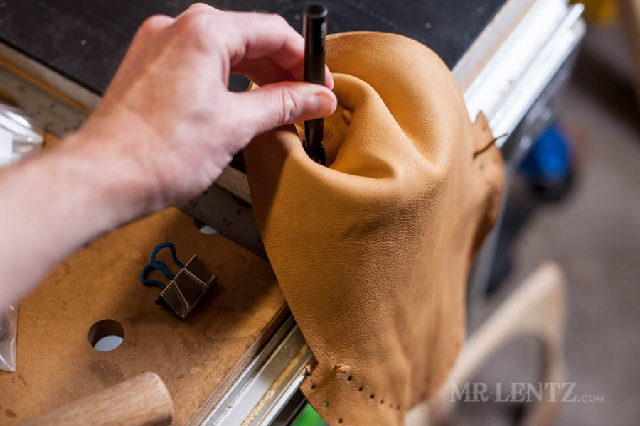 Using the same method for punching the stitching holes, I did the same for the back end of the body. Start your holes near the top, and end them where the leather starts to curve inward.