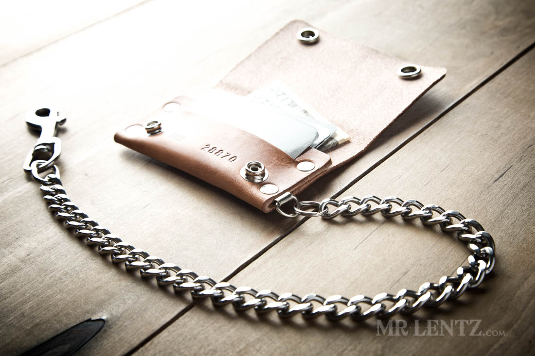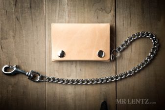 OPTION K – A nice heavy weight chain made of solid brass with a durable solid brass clip. Measures 18 inches long and a chain width of 3/8″ wide. Solid brass will develop a beautiful patina as it ages with the wallet.