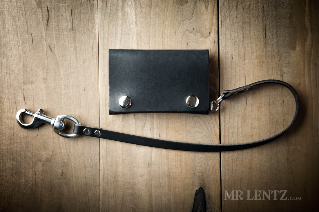 OPTION D – This leather chain strap ends in a snapping belt loop meant to go over belts up to 1.75″ wide. Made from one piece of solid full-grain leather, the other end attaches you your wallet via a stainless steel split ring. Leather color will match your wallet. Measures about 18″ long from end to end, 7/16″ width on strap section, and 7/8″ width on snap section.