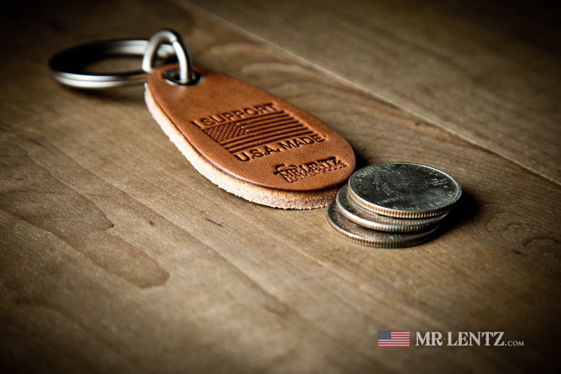 This piece includes a high end solid brass with nickel plating split key ring, solid brass nickel plated grommet and small split ring and thick U.S. Full Grain Leather. The leather part measures approximately 2.5 inches long x 1 5/16 inches wide x 3/16 inches thick. That’s as thick as my line of Casual Leather belts, or the same as 3 U.S. quarters stacked. Total length from top of key ring to bottom of leather is approximately 3 7/8 inches.