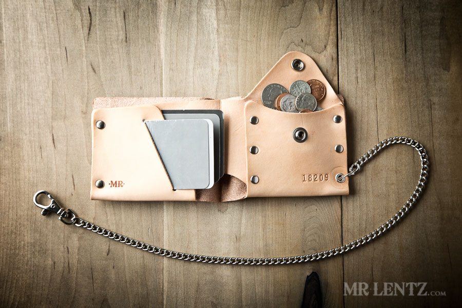 ** Design Update: I recently updated the hardware used to attach the chain to the wallet. Instead of the grommet shown in the photos, I now use a very small triangular D-ring that is directly attached to the rivet. Photos coming soon!