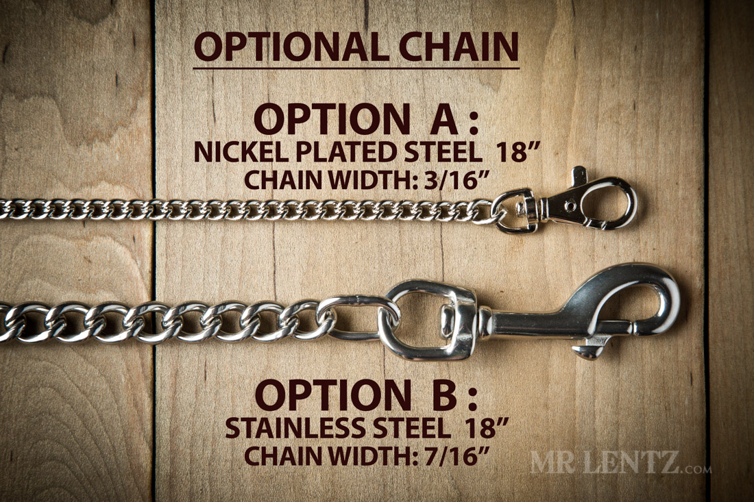 OPTION A – Is a lighter weight steel with nickel plating. It’s about 18 inches long and the chain width is 3/16″ wide.