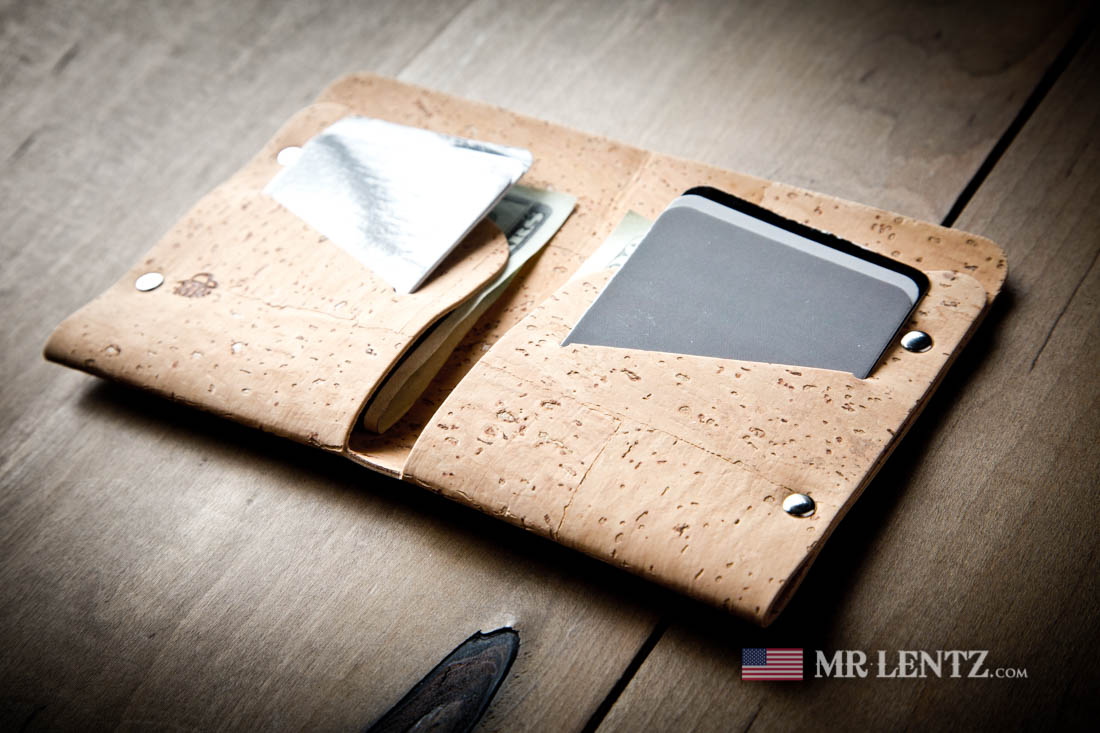 This wallet will easily fit 4 -6 cards ( possibly a few more if you allow the cork to stretch), receipts notes and bills. Bills fit by folding once and inserting into either side of the wallet.