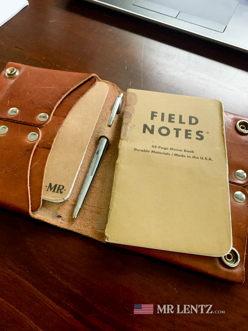 Today’s customer photos are from Charles R. showing off the Travel Wallet we made him. His wallet is showing 11 months of use at this point and was originally purchased in the Sun Tanned Natural color. This wallet makes a good all around document, cash, cards and note taking wallet while on the go. I designed it to have interior facing card pockets, a snap closure, and fit your passport….or the included free Field Notes journal. This wallet also comes with the famous original Fisher Space Pen (made in the USA). Charles’ wallet is looking good and darkening at a nice slow and even pace. Just how full-grain quality leather should.