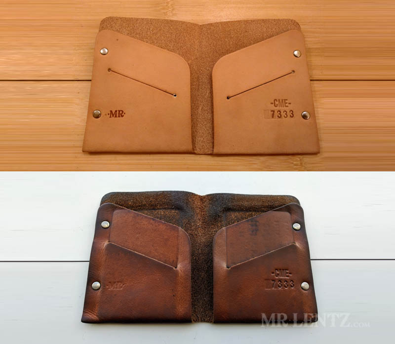 Today’s Customer photo is from Christopher E. showing off how his wallet has patina’d over 52 months of use! Wow, what an awesome before and after shot, this wallet was originally the Sun Tanned Natural color. The leather I use for these wallets is Full Grain Vegetable Tanned, and they absorb light, oils, scratches, pocket rubbing, and more – helping to age them into something of beauty. It looks like you’ve been taking good care of your wallet with a few coats of conditioner once in a while. I give a free tin of it out with every order. Thank you for the photo Christopher! Find this wallet here.