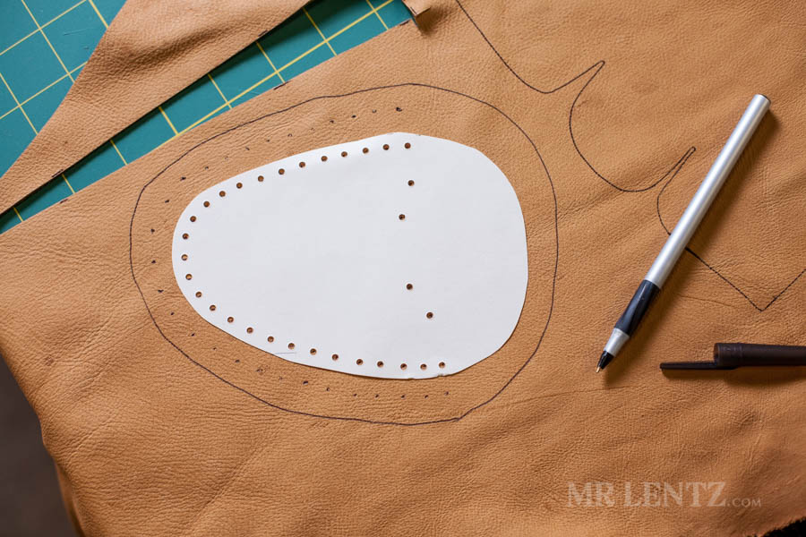 Go ahead and trace out your pattern onto the shearling liner, cut it out, and punch the holes. I used a pen for tracing as it is easier to see and the marks will be covered later with deer skin.