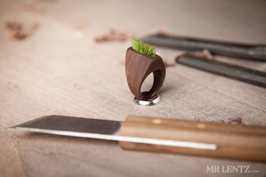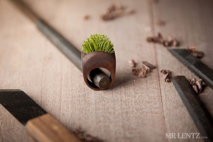 Each ring created so far is made with real grass or moss that has been dried and preserved to maintain its color and texture. The grass and moss is embedded into the wood and requires no maintenance whatsoever. Though you may want to rub on a little extra virgin olive oil onto the wood every few months if necessary.